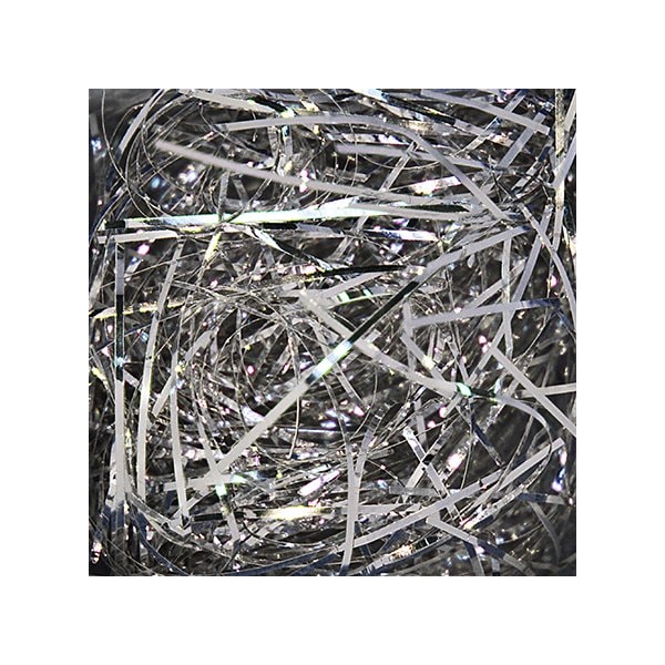 Instantly add an attractive upscale appearance to any package! Metallic PVC shreds cushion products while providing a unique sparkle; Perfect for retail and gift packaging; Silver Metallic; 10 lbs. per carton; See our line of Gift Boxes. This product is equivalent to part number: S-15485.