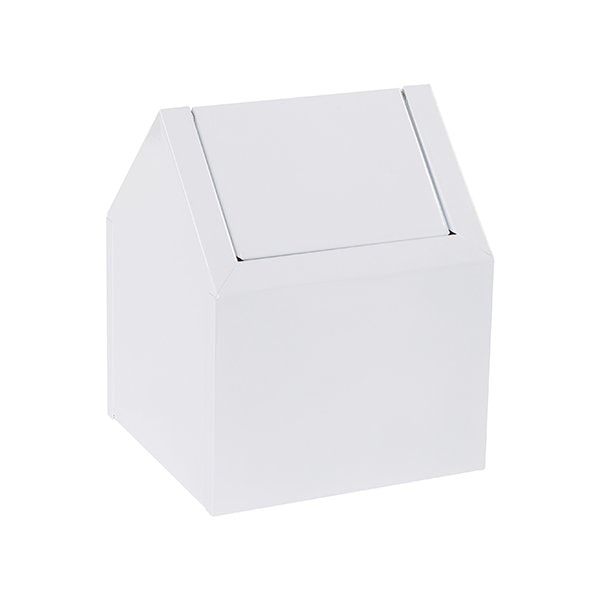 Swing-Top feminine hygiene receptacle. Powder coated, white metal construction; Swing-Top entry allows access from two sides. This product is equivalent to part number: H-3584.