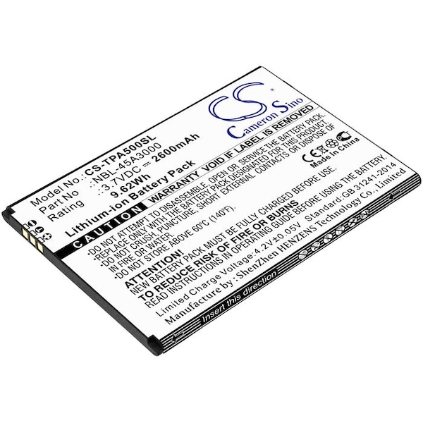 This is a replacement compatible with a Tp-Link Mobile Phone BatteryVolts: 3.7V 3.7 VoltsCapacity: 2600mAh 2.6AhType: Li-ionColor: BlackTp-Link Neffos A5 TP7032A Replacement Batteries.Mfgr Part # NBL-45A3000Dimensions: 3.55 in. L x 2.48 in. W x 0.18 H in.Weight: 0.2 lbWarranty: 1 YearDisclaimer: Our products are not affiliated with or authorized by Tp-Link.FAQsWhat is the best replacement battery for the Tp-Link Neffos A5 TP7032A Mobile Phone Battery?The CS-TPA500SL is the best replacement battery for the Tp-Link Neffos A5 TP7032A Mobile Phone Battery. What is your return policy and battery warranty?Our batteries are backed by easy 30-day returns and a 12-month warranty. How do I find the best replacement Battery?Our search tool at the top of the website should give you the best results. Search by brand or part number to see if we have the right match for you. What does Li-ion and Ni-MH mean?They represent different types of rechargeable batteries. Li-ion stands for Lithium Ion, lithium ions move from the negative electrode through an electrolyte to the positive electrode during discharge and back when charging. Ni-MH stands for nickel-metal hydride where the negative electrode is made from a hydrogen-absorbing alloy. Do you have a wholesale, reseller and large volume purchase program?Yes, our bulk purchasing program saves you money and allow you to obtain the batteries you need in one easy, hassle-free transaction. Apply here.