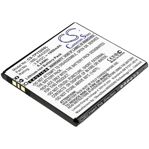 This is a replacement compatible with a Tp-Link Mobile Phone BatteryVolts: 3.8V 3.8 VoltsCapacity: 1800mAh 1.8AhType: Li-ionColor: BlackTp-Link Neffos Y5L Replacement Batteries.Mfgr Part # NBL-46A2020Dimensions: 2.4 in. L x 2.21 in. W x 0.19 H in.Weight: 0.3 lbWarranty: 1 YearDisclaimer: Our products are not affiliated with or authorized by Tp-Link.FAQsWhat is the best replacement battery for the Tp-Link Neffos Y5L Mobile Phone Battery?The CS-TPY520SL.2 is the best replacement battery for the Tp-Link Neffos Y5L Mobile Phone Battery. What is your return policy and battery warranty?Our batteries are backed by easy 30-day returns and a 12-month warranty. How do I find the best replacement Battery?Our search tool at the top of the website should give you the best results. Search by brand or part number to see if we have the right match for you. What does Li-ion and Ni-MH mean?They represent different types of rechargeable batteries. Li-ion stands for Lithium Ion, lithium ions move from the negative electrode through an electrolyte to the positive electrode during discharge and back when charging. Ni-MH stands for nickel-metal hydride where the negative electrode is made from a hydrogen-absorbing alloy. Do you have a wholesale, reseller and large volume purchase program?Yes, our bulk purchasing program saves you money and allow you to obtain the batteries you need in one easy, hassle-free transaction. Apply here.