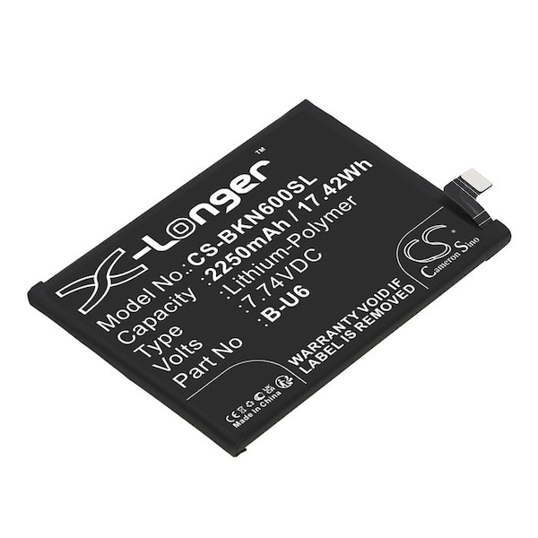 This is a replacement compatible with a Vivo Mobile Phone BatteryVolts: 7.74V 7.74 VoltsCapacity: 2250mAh 2.25AhType: Li-PolymerColor: BlackVivo iQOO Neo6 SE 5G V2199A Replacement Batteries.Mfgr Part # B-U6Dimensions: 3.42 in. L x 2.5 in. W x 0.2 H in.Weight: 0.3 lbWarranty: 1 YearDisclaimer: Our products are not affiliated with or authorized by Vivo.FAQsWhat is the best replacement battery for the Vivo iQOO Neo6 SE 5G V2199A Mobile Phone Battery?The CS-BKN600SL is the best replacement battery for the Vivo iQOO Neo6 SE 5G V2199A Mobile Phone Battery. What is your return policy and battery warranty?Our batteries are backed by easy 30-day returns and a 12-month warranty. How do I find the best replacement Battery?Our search tool at the top of the website should give you the best results. Search by brand or part number to see if we have the right match for you. What does Li-ion and Ni-MH mean?They represent different types of rechargeable batteries. Li-ion stands for Lithium Ion, lithium ions move from the negative electrode through an electrolyte to the positive electrode during discharge and back when charging. Ni-MH stands for nickel-metal hydride where the negative electrode is made from a hydrogen-absorbing alloy. Do you have a wholesale, reseller and large volume purchase program?Yes, our bulk purchasing program saves you money and allow you to obtain the batteries you need in one easy, hassle-free transaction. Apply here.