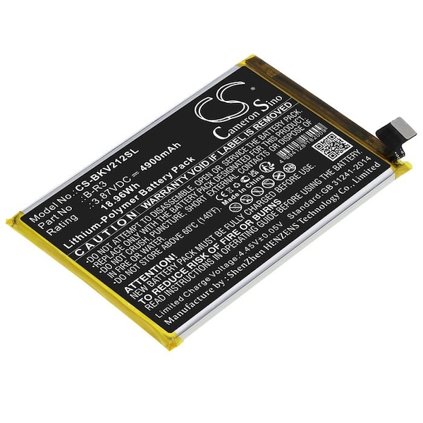 This is a replacement compatible with a Vivo Mobile Phone BatteryVolts: 3.87V 3.87 VoltsCapacity: 4900mAh 4.9AhType: Li-PolymerColor: BlackVivo T1x T1x 5G 2021 V2123A Replacement Batteries.Mfgr Part # B-R3Dimensions: 3.67 in. L x 2.47 in. W x 0.18 H in.Weight: 0.3 lbWarranty: 1 YearDisclaimer: Our products are not affiliated with or authorized by Vivo.FAQsWhat is the best replacement battery for the Vivo T1x T1x 5G 2021 V2123A Mobile Phone Battery?The CS-BKV212SL is the best replacement battery for the Vivo T1x T1x 5G 2021 V2123A Mobile Phone Battery. What is your return policy and battery warranty?Our batteries are backed by easy 30-day returns and a 12-month warranty. How do I find the best replacement Battery?Our search tool at the top of the website should give you the best results. Search by brand or part number to see if we have the right match for you. What does Li-ion and Ni-MH mean?They represent different types of rechargeable batteries. Li-ion stands for Lithium Ion, lithium ions move from the negative electrode through an electrolyte to the positive electrode during discharge and back when charging. Ni-MH stands for nickel-metal hydride where the negative electrode is made from a hydrogen-absorbing alloy. Do you have a wholesale, reseller and large volume purchase program?Yes, our bulk purchasing program saves you money and allow you to obtain the batteries you need in one easy, hassle-free transaction. Apply here.