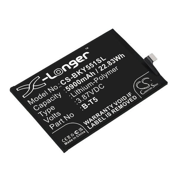 This is a replacement compatible with a Vivo Mobile Phone BatteryVolts: 3.87V 3.87 VoltsCapacity: 5900mAh 5.9AhType: Li-PolymerColor: BlackVivo V2164A Y55s Y55s 5G 2021 Replacement Batteries.Mfgr Part # B-T5Dimensions: 3.71 in. L x 2.51 in. W x 0.21 H in.Weight: 0.3 lbWarranty: 1 YearDisclaimer: Our products are not affiliated with or authorized by Vivo.FAQsWhat is the best replacement battery for the Vivo V2164A Y55s Y55s 5G 2021 Mobile Phone Battery?The CS-BKY551SL is the best replacement battery for the Vivo V2164A Y55s Y55s 5G 2021 Mobile Phone Battery. What is your return policy and battery warranty?Our batteries are backed by easy 30-day returns and a 12-month warranty. How do I find the best replacement Battery?Our search tool at the top of the website should give you the best results. Search by brand or part number to see if we have the right match for you. What does Li-ion and Ni-MH mean?They represent different types of rechargeable batteries. Li-ion stands for Lithium Ion, lithium ions move from the negative electrode through an electrolyte to the positive electrode during discharge and back when charging. Ni-MH stands for nickel-metal hydride where the negative electrode is made from a hydrogen-absorbing alloy. Do you have a wholesale, reseller and large volume purchase program?Yes, our bulk purchasing program saves you money and allow you to obtain the batteries you need in one easy, hassle-free transaction. Apply here.