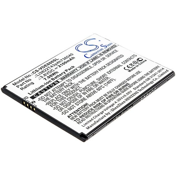 This is a replacement compatible with a Vodafone Mobile Phone BatteryVolts: 3.8V 3.8 VoltsCapacity: 2100mAh 2.1AhType: Li-ionColor: BlackVodafone Smart E8 VFD511 VFD513 Replacement Batteries.Mfgr Part # Li3822T43p4h736040Dimensions: 2.87 in. L x 2.36 in. W x 0.16 H in.Weight: 0.1 lbWarranty: 1 YearDisclaimer: Our products are not affiliated with or authorized by Vodafone.FAQsWhat is the best replacement battery for the Vodafone Smart E8 VFD511 VFD513 Mobile Phone Battery?The CS-VDE800SL.1 is the best replacement battery for the Vodafone Smart E8 VFD511 VFD513 Mobile Phone Battery. What is your return policy and battery warranty?Our batteries are backed by easy 30-day returns and a 12-month warranty. How do I find the best replacement Battery?Our search tool at the top of the website should give you the best results. Search by brand or part number to see if we have the right match for you. What does Li-ion and Ni-MH mean?They represent different types of rechargeable batteries. Li-ion stands for Lithium Ion, lithium ions move from the negative electrode through an electrolyte to the positive electrode during discharge and back when charging. Ni-MH stands for nickel-metal hydride where the negative electrode is made from a hydrogen-absorbing alloy. Do you have a wholesale, reseller and large volume purchase program?Yes, our bulk purchasing program saves you money and allow you to obtain the batteries you need in one easy, hassle-free transaction. Apply here.