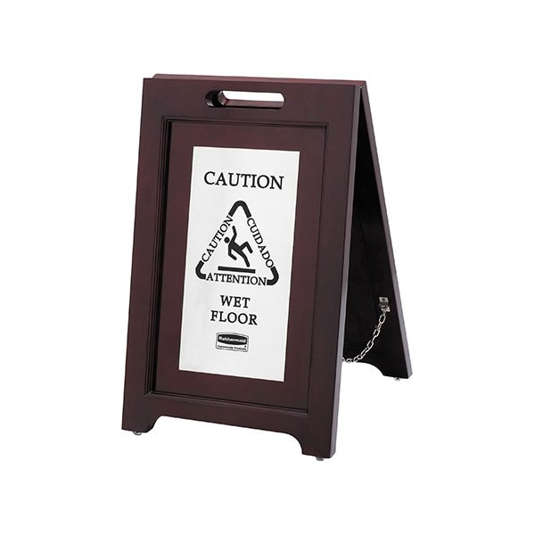 Elegant and sophisticated way to convey caution message. Hardwood finish with stainless steel plaque for an upscale appearance; Message printed in English, Spanish and French along with the international wet floor symbol; Non-slip, durable rubber feet help protect floors from scratches; Integrated carry handle allows for easy transport; Folding design for compact storage. This product is equivalent to part number: H-5876.