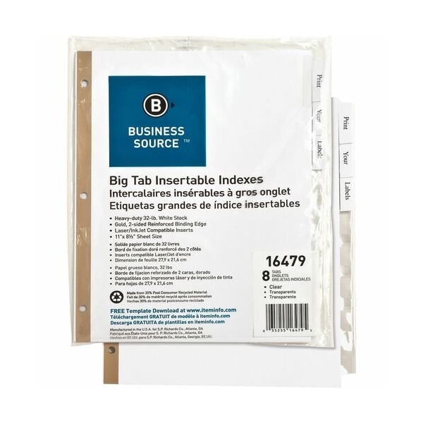 BSN 16479 Index Dividers, 8-Tab, 11x8-1/2'' White Stock/Clear T abs''