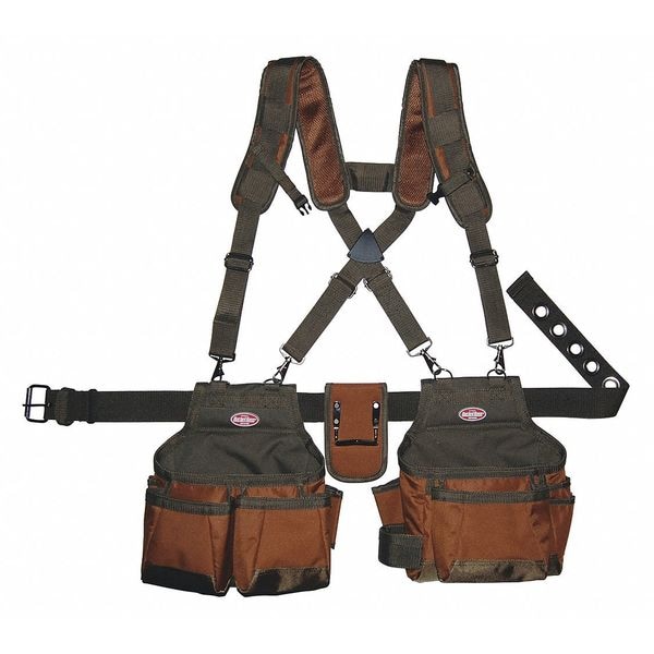 Single Body Construction; Barrel-Bottom, Super Capacity Pouches; Reinforced Pouch Bottoms; Adjustable Pouch and Rigging System; Removable Padded Suspenders; Dual Hammer Loops; Steel Buckle and Monster Grommets; Adjustable Chest Strap Buckle