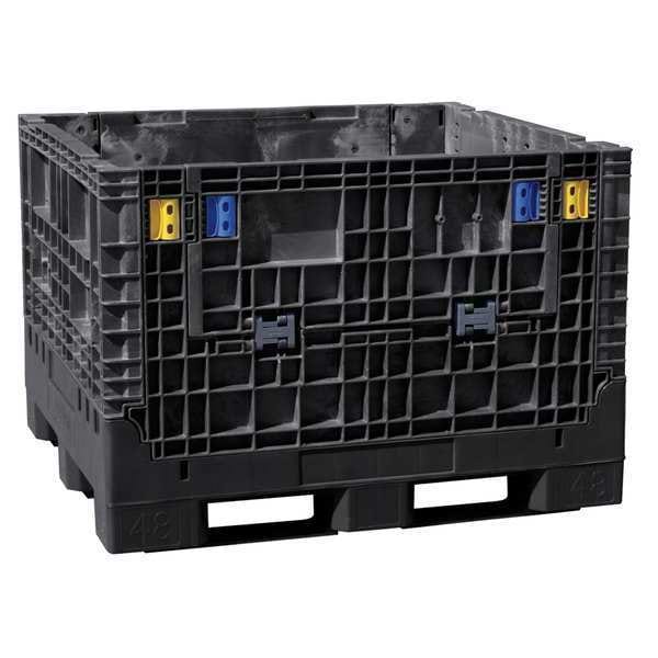 Collapsible Bulk Container, Color Black, Container Wall Type Solid, Folded Depth 48 in, Folded Height 12 7/8 in, Folded Width 45 in, Fork Entry 4-Way Entry, Fork Pockets Fork Pockets Included, Maximum Operating Temperature 120 Degrees F, Minimum Operating Temperature -20 Degrees F, Mobility Stationary, Number of Drop Doors 2, Overall Height 34 in, Overall Length 48 in, Overall Width 45 in, Stackable Stacking Capable, Volume Capacity 28.7 cu ft, Weight Capacity 2,500 lb, Collapsible Collapsible