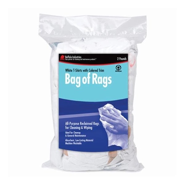 Good general-purpose wiper. White T-shirt material with colored trim or prints. Very absorbent. Made from 100% recycled material.