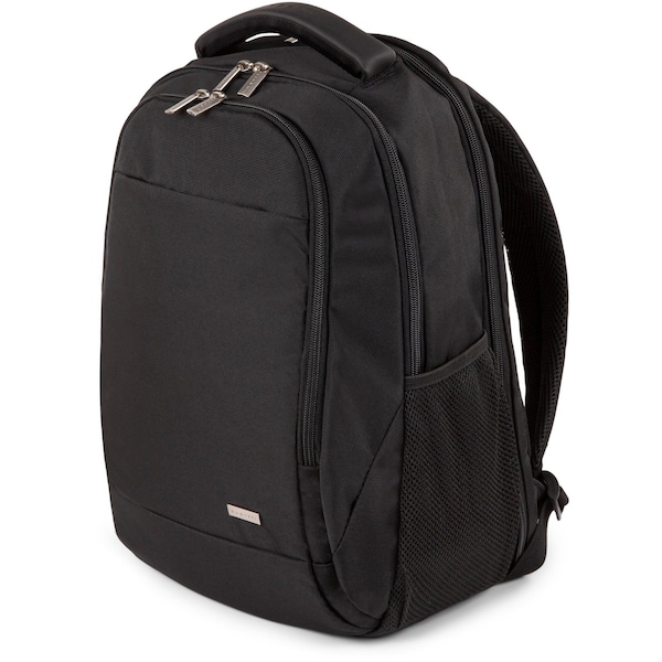Backpack features a padded laptop section that fits most 15.6" laptops to help prevent damage during travel. Large main compartment with double zippers accommodates all your business essentials. Lateral mesh pockets on the side are perfect for your water bottles. Front pocket with double zippers provides an organizer panel to keep track of smaller belongings. Back is padded and made of a mesh material to enhance comfort while carrying. Polyester backpack also includes an adjustable, padded shoulder strap to optimize comfort while carrying. Top carry handle is reinforced to handle the load.