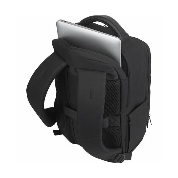 Backpack features a padded laptop section that fits most 15.6'' laptops to help prevent damage during travel. Large main compartment with double zippers accommodates all your business essentials. Lateral mesh pockets on the side are perfect for your water bottles. Front pocket with double zippers provides an organizer panel to keep track of smaller belongings. Back is padded and made of a mesh material to enhance comfort while carrying. Polyester backpack also includes an adjustable, padded shoulder strap to optimize comfort while carrying. Top carry handle is reinforced to handle the load.