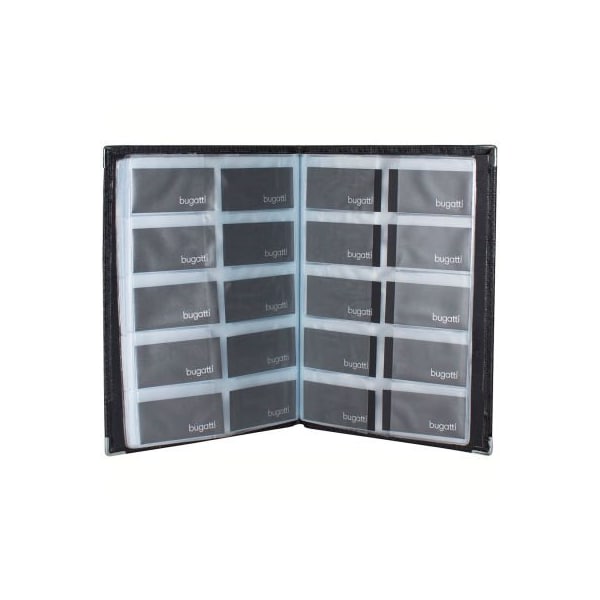 Bugatti bcc97359 textured synthetic leather business card case, black this bugatti business card case is made from textured synthetic leather. It measures 9" l x 12.5" h x 0.25" w and has a 320 card capacity, 10 up design and inside pocket