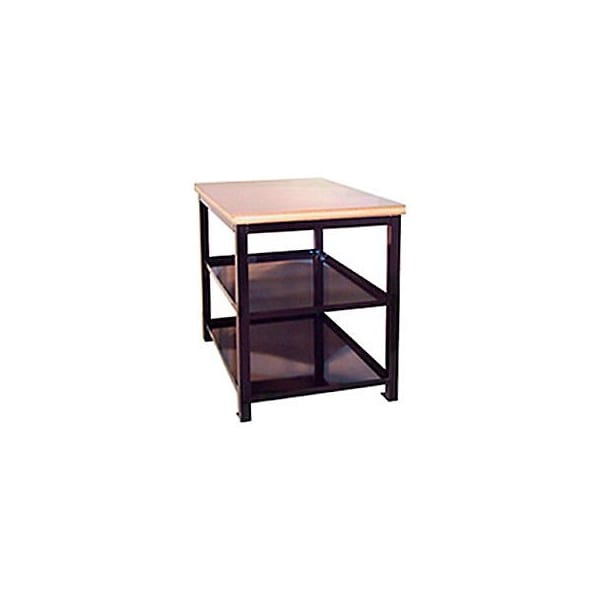 The double shelf shop stand features a durable, all-welded 18 gauge x 1-1/2" square tubular steel frame for added rigidity. It has a 3000 lbs capacity. The welded base plates allow floor anchoring for stability. The double shelf model features two fixed shelves with raised lips, 1-5/8" thick almond plastic laminate top and scratch-resistant beige enamel finish. Optional 4" casters for mobility reduce capacity to 1000 lbs.