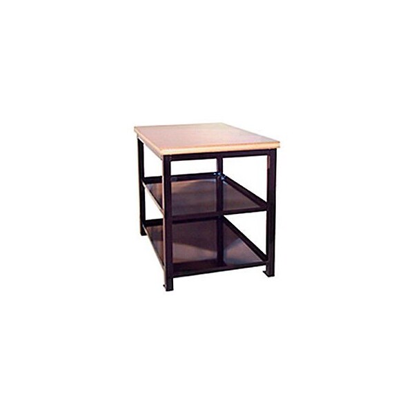 The double shelf shop stand features a durable, all-welded 18 gauge x 1-1/2" square tubular steel frame for added rigidity. It has a 3000 lbs capacity. The welded base plates allow floor anchoring for stability. The double shelf model features two fixed shelves with raised lips, 1-3/4" thick maple top and scratch-resistant blue enamel finish. Optional 4" casters for mobility reduce capacity to 1000 lbs.