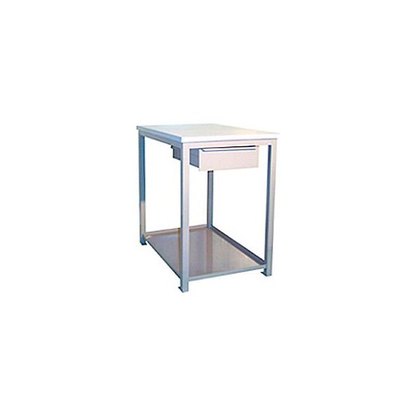 The shelf shop stand features a durable, all-welded 18 gauge x 1-1/2" square tubular steel frame for added rigidity. It has a 3000 lbs capacity. The welded base plates allow floor anchoring for stability. The drawer/shelf model features a fixed height shelf and one 12"w x 19-1/2"d x 4-3/4"h drawer, 1-5/8" thick almond plastic laminate top and scratch-resistant blue enamel finish. Optional 4" casters for mobility reduce capacity to 1000 lbs.