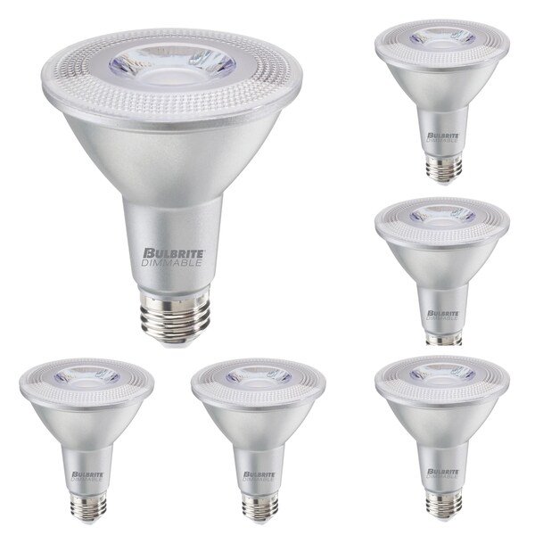 Included in this purchase are six individual LED flood lights. Flood lights are great for exterior illumination as well as safety and security. These PAR30LN bulbs each have an E26 screw base. They are fully dimmable and emit a warm white light. Like all ecofriendly LED bulbs, each is just 10 watts but will last an estimated 25,000 hours.