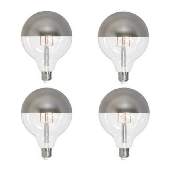 Long lasting, energy efficient LED combines with the unique technology of a clear finish bulb for a great bulb with an interesting lighting effect in this 4-pack of 6W LED G40 Filament Half Mirror Finish bulbs. Ideal for pendant fixtures, redirecting light upwards, and can be paired with a compatible dimmer to offer an adjustable warm white light.