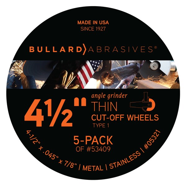 Bullard 53409 High Energy Performance, TA60OU-BF, T1 Angle Grinder Cut-Off Wheel, 4-1/2 x .045 x 7/8, Multi-Pack of 5
