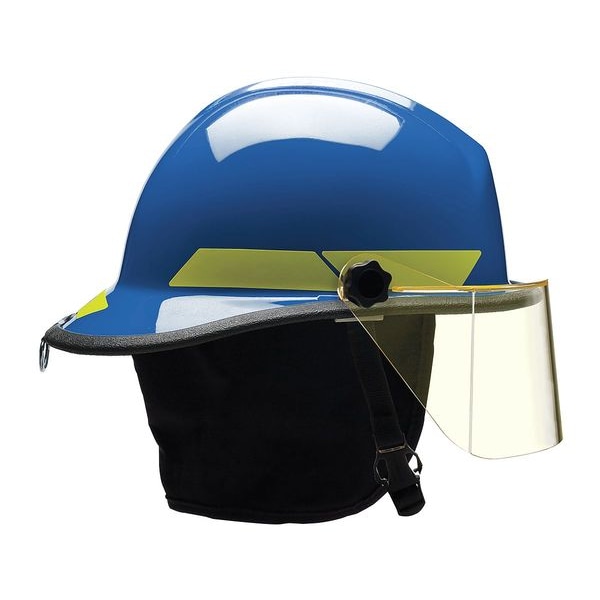 Fire Helmet, Modern, Blue, Thermoplastic Shell Material, Fits Hat Size 6-1/2 to 8, Nomex(R) Quick Release and Postman Slide Chin Strap, 6-Point Sure-Lock(R) Ratchet Suspension, Includes 4 in Faceshield, Standards NFPA 1971-2007