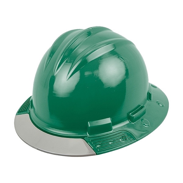 Full Brim Hard Hat, ANSI Classification Type 1, Class E, Head Protection Style Full Brim, Head Protection Suspension Type Ratchet (4-Point), Head Protection Color Green, Head Protection Graphics No Graphics, Fits Hat Size 6 1/2 to 8, Head Protection Material Polyethylene, Accessory Mounting Options Side-Slots, Head Protection Venting No