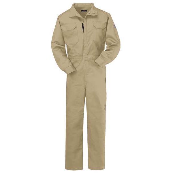 ATPV Rating 8.6 cal/sq cm, Arc Flash PPE Category 2, Closure Type Zipper, Collar Style Stand-Up, Color Khaki, Fabric Weight 7 oz, Features Concealed Nomex(R) Taped Brass Break-Away, Deep Pleated Action Back, Elastic Waist Inserts, Side Vent Openings with Snap Closure, Two-Way, Gender Men's, Inseam 32 in, Coverall, Material Trade Name ComforTouch(R), Maximum Chest Size 45 in, Maximum Waist Size 41 in, Minimum Chest Size 43 1/2 in, Number of Outside Pockets 8, Size L, Sleeve Length 35 in