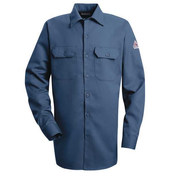 ATPV Rating 8.6 cal/sq cm, Arc Flash PPE Category 2, Collar Style Lay-Flat, Color Navy, Fabric Weight 7 oz, Features One-Piece Lined Cuffs with Button Closures, Sleeve Vents, Closure Type Buttons, Gender Men's, High-Visibility No, Flame-Resistant Collared Shirt, Material Trade Name ComforTouch(R), Maximum Chest Size 44 in, Maximum Waist Size 44 in, Minimum Chest Size 40 1/2 in, Neck Style Collar, Number of Pockets 2, Pattern Solid, Pocket Location Chest, Size L, Sleeve Length 36 3/4 in