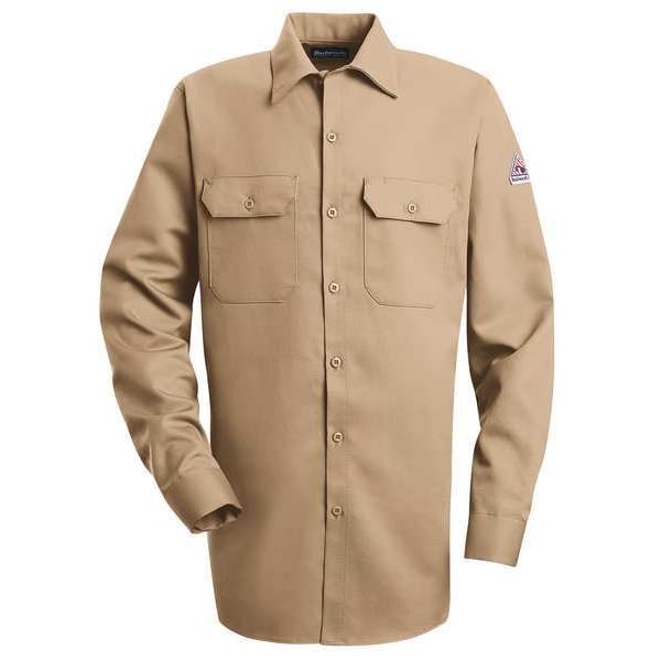 ATPV Rating 8.6 cal/sq cm, Arc Flash PPE Category 2, Collar Style Lay-Flat, Color Tan, Fabric Weight 7 oz, Features One-Piece Lined Cuffs with Button Closures, Sleeve Vents, Closure Type Buttons, Gender Men's, High-Visibility No, Flame-Resistant Collared Shirt, Material Trade Name ComforTouch(R), Maximum Chest Size 40 in, Maximum Waist Size 40 in, Minimum Chest Size 36 1/2 in, Neck Style Collar, Number of Pockets 2, Pattern Solid, Pocket Location Chest, Size M, Sleeve Length 34 3/4 in