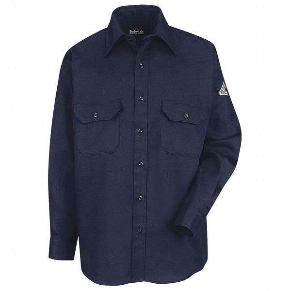 ATPV Rating 9.1 cal/sq cm, Arc Flash PPE Category 2, Collar Style Lay-Flat, Color Navy, Fabric Weight 6 oz, Features Straight Back Yoke, Tailored Sleeve Placket, Topstitched Cuff, Two Chest Pockets with Button Flap Closures and Sewn-in Pencil Stall, Closure Type Buttons, Gender Men's, High-Visibility No, Flame-Resistant Collared Shirt, Material Trade Name ComforTouch(R), Maximum Chest Size 42 in, Maximum Waist Size 40 in, Minimum Chest Size 38 1/2 in, Neck Style Collar, Number of Pockets 2