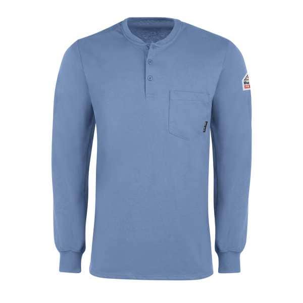ATPV Rating 8.9 cal/sq cm, Arc Flash PPE Category 2, Collar Style Lay-Flat, Color Light Blue, Fabric Weight 7 oz, Features Double-Layer, FR Cotton Rib-Knit Collar, FR Cotton Rib-Knit Cuff, Sized to Protect the Neck, Closure Type Buttons, Gender Men's, High-Visibility No, Henley Shirt, Material Trade Name Excel FR(R), Maximum Chest Size 41 in, Minimum Chest Size 37 1/2 in, Neck Style Collar, Number of Pockets 1, Pattern Solid, Pocket Location Chest, Size M, Sleeve Length Type Long