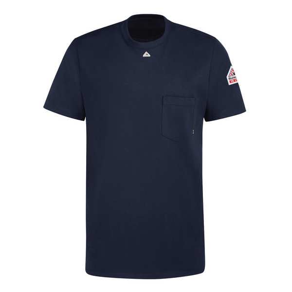 ATPV Rating 8.9 cal/sq cm, Arc Flash PPE Category 2, Collar Style Lay-Flat, Color Navy, Fabric Weight 7 oz, Features Heat Seal Bulwark(R) Triangle Centered at Neck to Show Wearer has on FR Undergarment, Hemmed Sleeve, Gender Men's, High-Visibility No, T-Shirt, Material Trade Name Excel FR(R), Maximum Chest Size 41 in, Minimum Chest Size 37 1/2 in, Neck Style Crew Neck, Number of Pockets 1, Pattern Solid, Pocket Location Left Chest, Size M, Sleeve Length Type Short, Standards NFPA 2112, UL