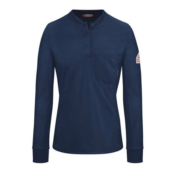 ATPV Rating 9.6 cal/sq cm, Arc Flash PPE Category 2, Collar Style Lay-Flat, Color Navy, Fabric Weight 7.3 oz, Features Tagless Brand Label and Warning Label, Closure Type Buttons, Gender Women's, High-Visibility No, Henley Shirt, Material Trade Name Excel FR(R), Maximum Chest Size 39 1/2 in, Minimum Chest Size 37 in, Neck Style Collar, Number of Pockets 1, Pattern Solid, Pocket Location Chest, Size M, Sleeve Length Type Long, Standards NFPA 2112, UL, Size - Body Type Regular