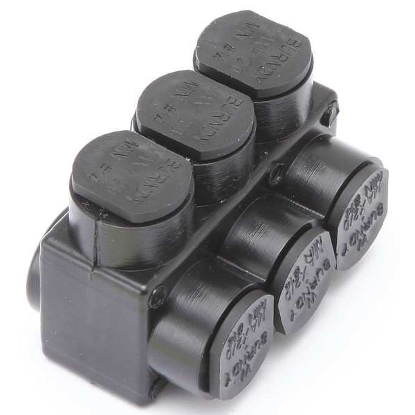 Insulated Multitap Connector, Body Material Aluminum, Color Black, Finish Unplated, For Conductor Material Aluminum, Copper, For Stranded Copper Wire Size - Minimum 14 AWG, For Stranded Copper Wire Size - Maximum 2/0 AWG, Head Style Hex, Hex Size 3/16 in, Insulation Material Plastisol, Maximum Operating Temperature 194 Degrees F, Maximum Voltage 600 V, Mounting Hole Size Not Applicable, Number of Ports 3, RoHS Compliant Yes, Standards UL Listed, Compatible with Product Type Code Conductor