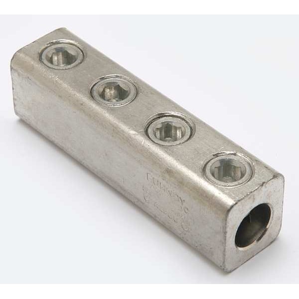 Mechanical Connector, For Conductor Material Aluminum, Copper, For Stranded Copper Wire Size - Minimum 6 AWG, For Stranded Copper Wire Size - Maximum 250 kcmil, For Stud Size 5/8 in, Head Style Hex Socket, Number of Holes Not Applicable, Hole Diameter Not Applicable, Hole Spacing Not Applicable, Body Material Aluminum, Maximum Operating Temperature 194 Degrees F, Maximum Voltage 600 V, Number of Conductors 2, Number of Terminations 4, Tongue Width Not Applicable, Tongue Thickness Not Applicable
