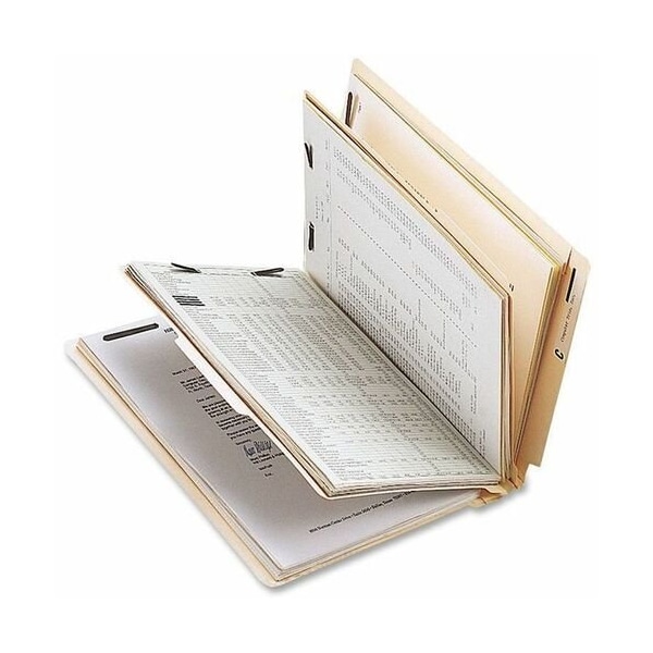 Classification folders with end tabs and fasteners create subdivisions of materials within one folder. 2'' bonded fasteners on the front and back panels and the two dividers create six separate filing surfaces. Use classification folders to identify different types of letter-size project files. Folders are made of 18 point cover stock.