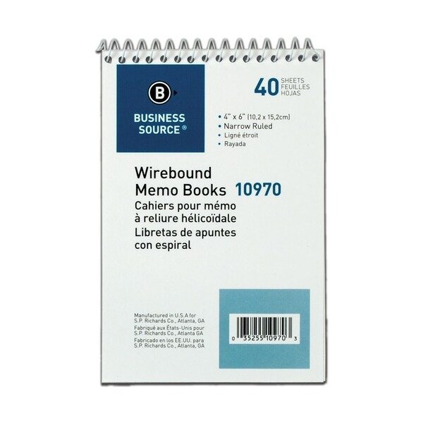 Wirebound Memo Book features a rigid chipboard cover, wire binding at the top, and white paper with narrow, faint blue, 1/4'' ruling.