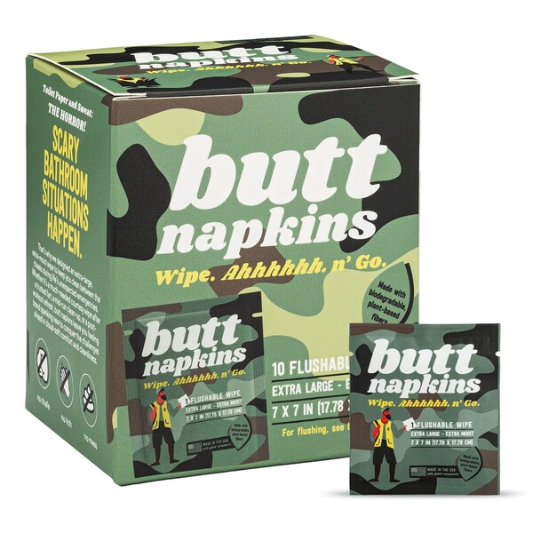 Hunting Butt Napkins are cloud-soft wipes designed for hunters who need reliable cleanliness in the field. Each of the 10 individually wrapped, water-based flushable wipes is made with biodegradable, plant-based fibers, ensuring theyre both gentle and eco-friendly. Unscented and hypoallergenic, these wipes wont give away your position while keeping you fresh and comfortable during long days outdoors. Compact and portable, Hunting Butt Napkins are a must-have for every hunting trip. Certified flushable and ready for any adventure.