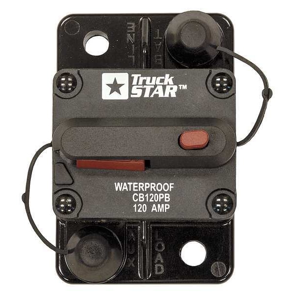 Automotive Circuit Breaker, Mount Type Bolt On, Mount Style Surface, Current Rating 120 A, Voltage Rating 42V DC, Interrupt Rating 120 A at 42V DC, Terminal Connection Stud, Actuator Push-to-Trip, Circuit Breaker Type Hi-Amp Circuit Breaker, Compatible Product Type Auxiliary and Accessory Circuits, Housing Material Plastic, Overall Depth 2 7/8 in, Overall Width 1 7/8 in, Reset Type Manual, Series CB