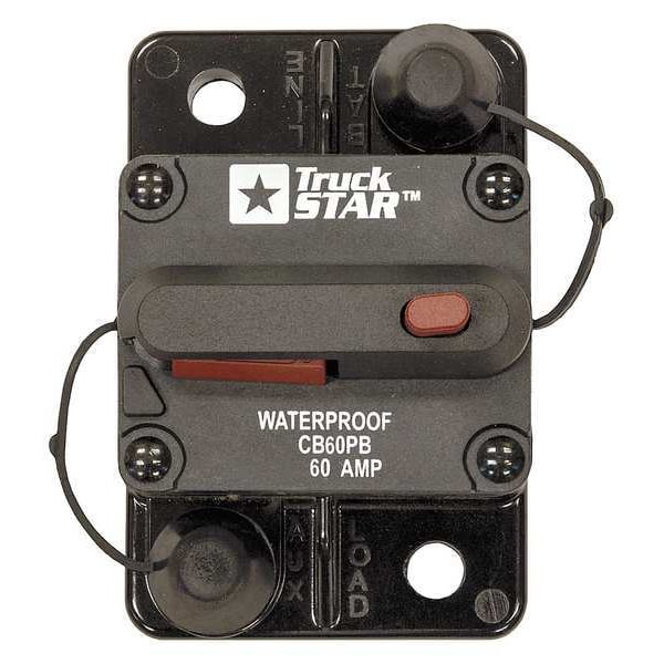 Automotive Circuit Breaker, Mount Type Bolt On, Mount Style Surface, Current Rating 60 A, Voltage Rating 42V DC, Interrupt Rating 60 A at 42V DC, Terminal Connection Stud, Actuator Push-to-Trip, Circuit Breaker Type Hi-Amp Circuit Breaker, Compatible Product Type Auxiliary and Accessory Circuits, Compatible Vehicle Type Dump Trucks, Snow Plows, Trucks, Housing Material Plastic, Overall Depth 2 7/8 in, Overall Width 1 7/8 in, Reset Type Manual, Series CB