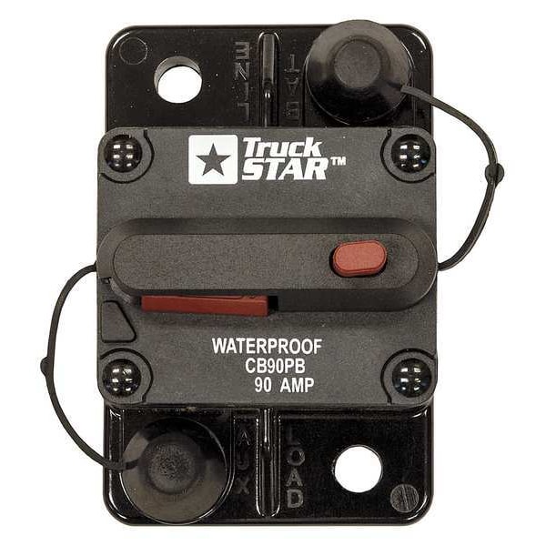 Automotive Circuit Breaker, Mount Type Bolt On, Mount Style Surface, Current Rating 90 A, Voltage Rating 42V DC, Interrupt Rating 90 A at 42V DC, Terminal Connection Stud, Actuator Push-to-Trip, Circuit Breaker Type Hi-Amp Circuit Breaker, Compatible Product Type Auxiliary and Accessory Circuits, Compatible Vehicle Type Dump Trucks, Snow Plows, Trucks, Housing Material Plastic, Overall Depth 2 7/8 in, Overall Width 1 7/8 in, Reset Type Manual, Series CB