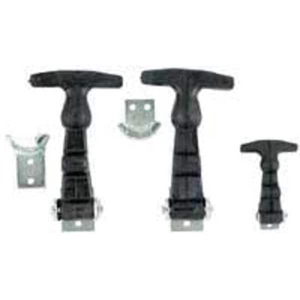 Hood Latch, Latch Type Catch, Latch Shape T-Shape, Handle Length 3 in, Latch Length 4 7/8 in, Latch Material Rubber, Latch Color Black, Bracket Finish Zinc Plated, Bracket Included Yes, Bracket Material Carbon Steel, Includes Brackets and Pin, Latch Finish Plain, Latch Style U-Shaped Ball Cup