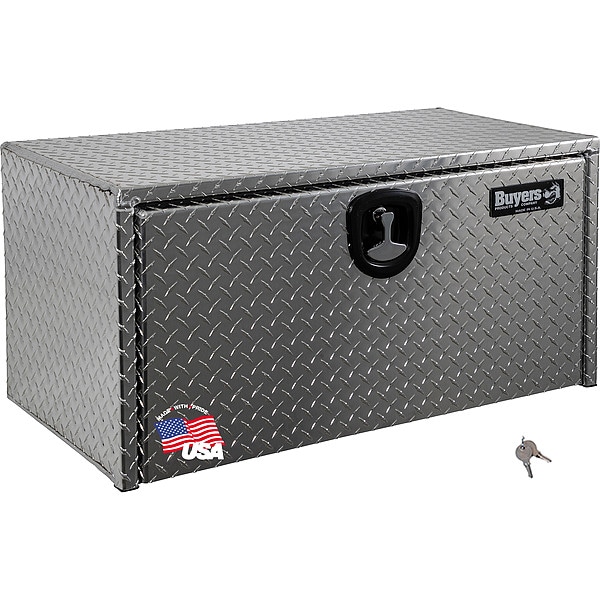 Underbody Truck Box, Silver, Single Drop-Down Door, Overall Width 36 in, Overall Depth 18 in, Overall Height 18 in, Storage Capacity 6.7 cu ft, 0.1 in Gauge, Mounting Style Bolt-On, Locking System Keyed, Latch Mechanism T-Handle Compression, Body Material Aluminum, Cover Material Aluminum, Lid Type Non-Adjustable, Features Compression Latch System, Replaceable Gasket Sealing System, Lid Hinge Yes, Weather Resistant Yes