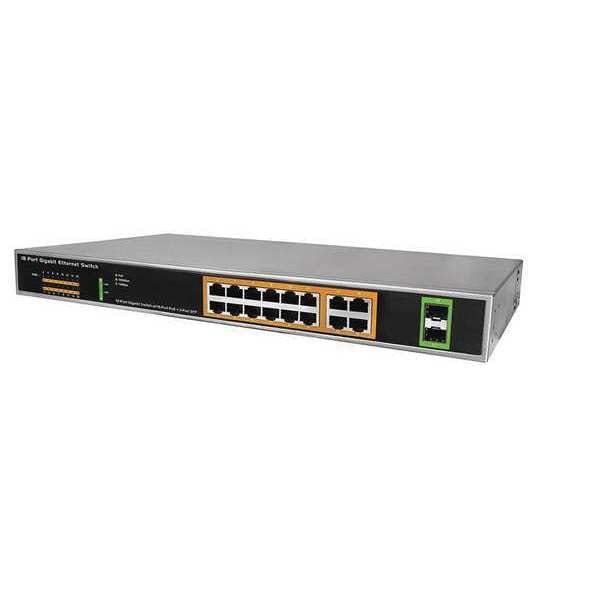 PoE Switch, Product Type PoE Switch, Number of IP Camera Inputs 16, Maximum Input Voltage 100/240V AC, Maximum Output Voltage 54V DC, Mounting Location Rack, Color Gray, Features Extend Function Transmission Distance to 656 ft, Includes Power Cord, Input Type (16) Port PoE Switch with 2 Uplink, Manufacturers Warranty Length 1 yr, Material Metal, Overall Depth 17 1/4 in, Overall Height 17 1/4 in, Overall Width 1 7/8 in, Standards IEEE 802.3af, IEEE 802.3at