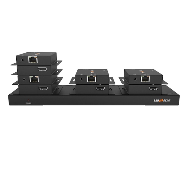 The BG-HDA-E18 is a 4K 1x8 HDMI splitter that can split a single HDMI source signal to eight displays at distances up to 70 meters over CAT6 networking cable. This splitter is a great choice for users that need to output a single video source like a Blu-ray player, computer, game console, or streaming media player to multiple displays. Ease of installation and high quality video are hallmarks of the BG-HDA-E18. The splitter supports resolutions as high as 4K2K@30Hz 4:4:4, ensuring no quality is lost when your input is split between the eight outputs. The splitter has one HDMI input, one HDMI loop output, and eight CAT outputs. The signal can be extended at distances up to 50m/164ft at 4K@30Hz resolution or up to 70m/230ft at 1080p@60Hz. This splitter also supports power over cable POC from the transmitter to receiver, eliminating the need for an external power supply at the receiver. The device is also HDMI 1.4 and HDCP 1.4 compliant. The BG-HDA-E18 has the ability to handle multiple audio formats, including LPCM 7.1CH, Dolby True HD, and DTS-HD. Link lights on the RJ45 ports provide a visual indication of connection status for at-a-glance troubleshooting. A set of DIP switches on the transmitter provide access to advanced EDID management for the BG-HDA-E18. One-way IR control signal pass-through provides source control from the receivers. The IR receivers can accept and transmit a signal from up to 8 meters away.
