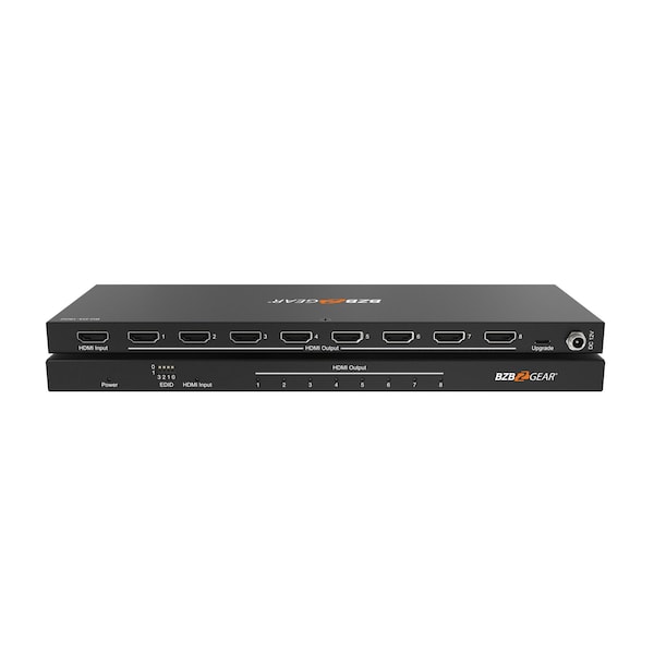 The BG-DA-18G2 HDMI splitter lets you distribute an HDMI signal to 8 separate outputs. It supports the latest HDMI 2.0 18Gbps specification, including HDR for vivid visuals. You can enjoy stunning 4K UHD resolution at 60Hz with 4:4:4 color depth, as well as all common video resolutions. This splitter also supports all HDMI audio formats, such as Dolby TrueHD, Atmos, and DTS-HD Master Audio, for superior sound quality. With advanced EDID management and HDCP 2.2 compliance, you can expect seamless compatibility with your devices. The BG-DA-18G2 is ideally used for home theater, entertainment room, lecture room, hall presentation, showroom, demo room, and public commercial display. To use dip switches for EDID management, locate the dip switch or block on the device, determine the switch configuration for the desired EDID data, set the switches according to the configuration, power cycle the device, and verify the new EDID configuration. Consult the device manual or product specifications for specific instructions.