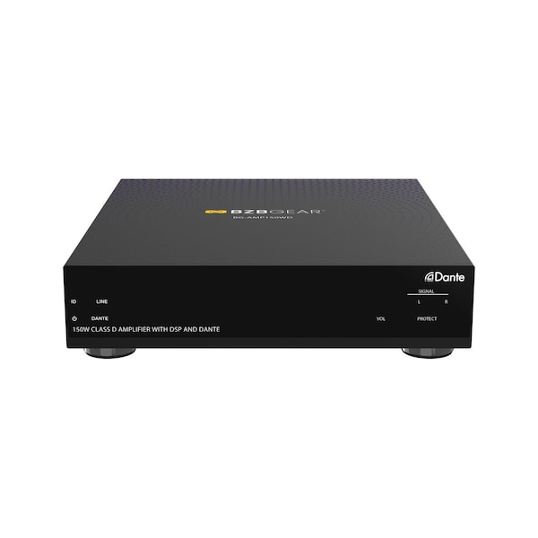 Overview The BG-AMP150WD is a versatile two-channel class D amplifier designed for modern AV installations, delivering high performance and efficiency. It supports low-impedance (4Ω/8Ω) stereo systems and constant-voltage (70V/100V) speaker setups, making it suitable for commercial and professional audio environments. With a maximum output of 2 x 75 watts in stereo mode or 150 watts in bridged mode, the amplifier ensures powerful audio performance, while Lo-Z and Hi-Z output switching allows seamless adaptation to various speaker types. Independent input gain, output EQ, and volume control provide precise audio tuning for any setup. Equipped with a built-in DSP processor, the BG-AMP150WD offers high-fidelity audio with a 48kHz sampling rate and 24-bit independent A/D and D/A converters. It accommodates Dante 2-channel digital audio as well as balanced or unbalanced line-level analog inputs, with outputs including AMP, line-level analog, and Dante digital audio for flexible integration. Additional features include auto-standby, RS-232, LAN, and Web GUI control. Features in Depth The BG-AMP150WD utilizes advanced class D technology, delivering up to 2 x 75 watts in low impedance (4Ω/8Ω) stereo mode and 150 watts in bridged high impedance (70V/100V) mode. It features Dante 2-channel digital audio inputs and outputs, along with balanced and unbalanced line-level analog inputs and outputs for versatile connectivity, including 1x Dante Network audio input, 1x LINE balanced stereo 0dBu/10kΩ input, 1x Dante Network audio output, and 1x Stereo or constant voltage 70V/100V speaker output. With a built-in DSP processor, the amplifier offers precise audio control with independent input gain, output EQ, and volume adjustments, operating at a 48KHz sampling rate with 24-bit A/D and D/A converters for superior audio quality. The amplifier's input sensitivity is set at full power at 0.775V (0dBu), and it supports a maximum voltage gain of 27 - 30dB SE/39 - 42dB BTL. It boasts a frequency response of 20Hz - 20kHz at ±3dB, a signal-to-noise ratio of 87dB (20Hz - 10kHz), and a THD+N (1KHz at 1W) of 0.04%. Control options include RS-232, LAN, and a Web GUI, with a 5-12V trigger input for seamless system integration and an auto-standby function for energy efficiency. The amplifier supports various audio formats, including analog and digital audio, with inputs and outputs designed for maximum performance.