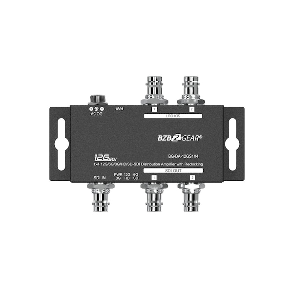 The BG-DA-12GS1X4 is a 1x4 12G-SDI splitter and distribution amplifier. This device can split an SD, HD, 3G, 6G, or 12G-SDI video source up to four SDI outputs simultaneously. For any situation where range, quality, consistency, and reliability are all factors, this unit is the correct choice. Whether you need to connect additional displays for video feed monitoring, distribute a 4K signal over a long distance, or daisy chain and cascade multiple units to build a large scale video distribution solution - the BG-DA-12GS1X4 will help you get the job done. Each output from the BG-DA-12GS1X4 is buffered independently and re-clocked eliminating signal disruption and making it possible to extend signal transmission to greater distances. With automatic input cable equalization, 12G-SDI signal can be transmitted up to 70m 230 ft, 6G up to 100m 330 ft, and up to 180m 594 ft for 3G connections. The device has a maximum SDI bandwidth of 11.88 Gbps to support high quality video transmission with low latency when splitting video to multiple outputs. Installers can also utilize the devices LED indicators that show the status of signal lock and current video rate to reduce the amount of time system configuration is needed. The devices design is built around quality and durability. With an inter-locking power supply and SDI connectors as well as a metal housing with mounting brackets, this device is built to last while maintaining reliable video transmission. TAA COMPLIANT PRODUCT. This product meets the standards of the Trade Agreement Act TAA.
