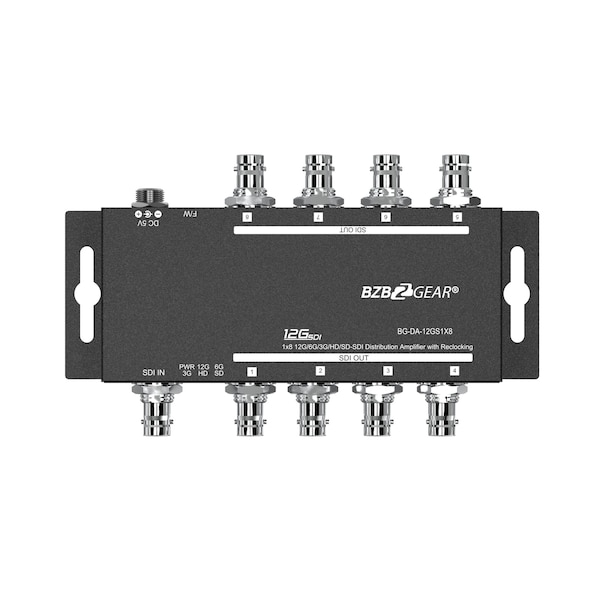 The BG-DA-12GS1X8 is a 1x8 12G-SDI splitter and distribution amplifier. This device can split an SD, HD, 3G, 6G, or 12G-SDI video source up to eight SDI outputs simultaneously. For any situation where range, quality, consistency, and reliability are all factors, this unit is the correct choice. Whether you need to connect additional displays for video feed monitoring, distribute a 4K signal over a long distance, or daisy chain and cascade multiple units to build a large scale video distribution solution - the BG-DA-12GS1X8 will help you get the job done. Each output from the BG-DA-12GS1X8 is buffered independently and re-clocked eliminating signal disruption and making it possible to extend signal transmission to greater distances. With automatic input cable equalization, 12G-SDI signal can be transmitted up to 70m 230 ft, 6G up to 100m 330 ft, and up to 180m 594 ft for 3G connections. The device has a maximum SDI bandwidth of 11.88 Gbps to support high quality video transmission with low latency when splitting video to multiple outputs. Installers can also utilize the devices LED indicators that show the status of signal lock and current video rate to reduce the amount of time system configuration is needed. The devices design is built around quality and durability. With an inter-locking power supply and SDI connectors as well as a metal housing with mounting brackets, this device is built to last while maintaining reliable video transmission. TAA COMPLIANT PRODUCT. This product meets the standards of the Trade Agreement Act TAA.