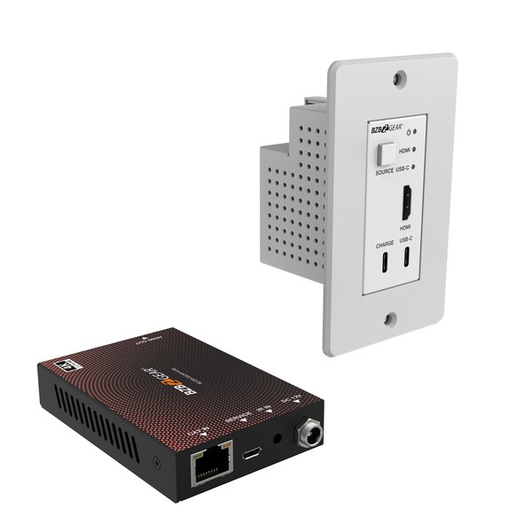 Introducing the BG-EXH-50UWP-W 18Gbps CAT 164ft Wall Plate Kit, a comprehensive solution for seamless signal transmission and distribution. This kit comprises a USB-C/HDMI Transmitter and a CAT6 to HDMI Receiver, designed to meet the demands of modern AV installations. Enclosed within a sleek one-gang Decora-style enclosure, the wall plate transmitter serves as a versatile 2x1 switcher and CAT transmitter, accommodating HDMI and USB-C inputs.With support for resolutions up to 4K2K 50/60Hz 4:4:4 and a transmission distance of up to 164ft / 50m via CAT6 output, this kit ensures exceptional visual fidelity and flexibility. Additionally, the BG-EXH-50UWP-W kit supports various HDMI audio formats, HDR, and features a user-friendly interface with automatic/manual input signal selection. Its compatibility with Power Over Cable POC further enhances convenience, allowing remote powering from the receiver or other CAT-equipped devices.The USB-C/HDMI Wall Plate Transmitter in the BG-EXH-50UWP-W kit embodies versatility and innovation in signal transmission. Equipped with HDMI and USB-C inputs, it caters to diverse multimedia platforms, ensuring compatibility across a wide range of source devices. Featuring a discreet one-gang enclosure tailored for Decora-style wall plate openings, the transmitter seamlessly integrates into any environment while offering convenient access to input ports.Supporting resolutions up to 4K2K 50/60Hz 4:4:4 and featuring a CAT6 output extending transmission distances up to 164ft / 50m, it guarantees exceptional visual fidelity and flexibility in signal distribution. With Power Over Cable POC support, the transmitter can be conveniently powered by the receiver or other CAT-equipped devices, streamlining installation and operation. The intuitive interface, along with automatic/manual input signal selection modes, ensures ease of use and adaptability to various AV setups, making the USB-C/HDMI Wall Plate Transmitter an indispensable component of professional multimedia installations.The CAT6 to HDMI Receiver in the BG-EXH-50UWP-W kit stands as a testament to reliability and efficiency in signal reception and distribution. Designed to seamlessly integrate into AV setups, it efficiently receives signals from the transmitter over extended distances using standard CAT6 cables. Supporting resolutions up to 4K2K 50/60Hz 4:4:4, the receiver ensures crisp and vibrant visuals, enriching the viewing experience.