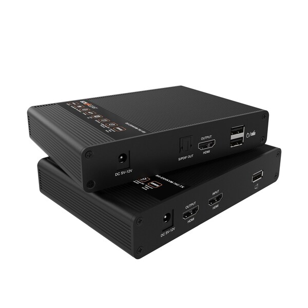 With a new IPCOLOR technology a global leading and innovative protocol for UHD video digital transmission with lossless compression this extender is capable of transmitting HDMI and USB signals with zero latency gamers loved it across distances of up to 70 meters 230 ft over a single Cat6/6a/7 cable.If your computer makes uncomfortable level of noise and you want to send it away to the basement and work peacefully in your office, or if your company policies require your workstation to be locked in server room these are exactly why KVM extender was created. When you need to separate your PC and your Display/Keyboard&Mouse for a long distance this device will serve you well.You can use USB connectors on the receiver not only for your mouse and keyboard, but also for other USB 2.0 devices like storage drives. S/PDIF connector on the receiver will de-embed audio signal from HDMI, so you can connect your local audio system.BG-EXHKVM-70C supports resolutions up to 4K 60fps HDR10 as well as many audio formats like LPCM/DTS-HD/DTS-Audio/Dolby Digital 5.1CH.Aluminum housing and integrated surge protection provides more durability for your setup.