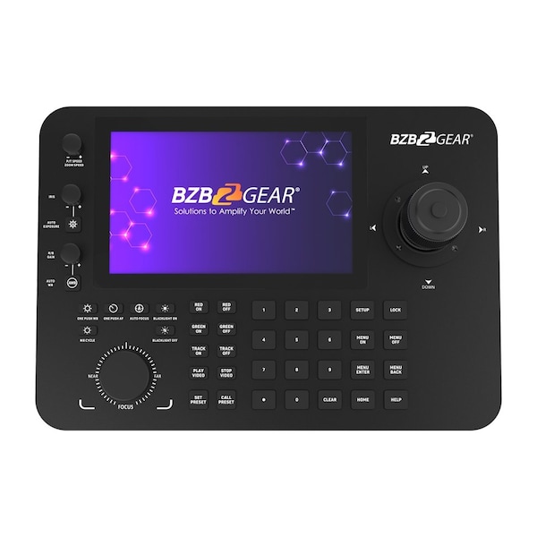 The BG-COMMANDER-PRO is a versatile PTZ camera joystick controller featuring a 7 touch screen, real-time video previews, and Android 11 OS. It supports simultaneous viewing of 4 RTSP streams or a single full-screen image. With H.265/H.264 decoding, it offers efficient video processing.The BG-COMMANDER-PRO also facilitates HDMI projection and can output 4 additional RTSP streams to an external display for simplified monitoring. It provides seamless PTZ control for preset positions, focus, zoom, and exposure settings, and can even access a camera's web interface. Designed for BG-ADAMO cameras, the unit offers quick access to red/green tally lights control and auto tracking activation.Highly Customizable and Easy to ManageWith HDMI projection and total PTZ control including presets, focus, zoom, and exposure, easily control your PTZ cameras for better broadcasting production. The Commander Pro is also customizable with single IP multi-channel acquisition and ONVIF protocol support, meaning you can add up to 2048 devices.User-Friendly and Future ProofThe Commander Pro was designed to be user-friendly. It can be upgraded through a standard USB flash drive, utilize an external mouse/keyboard for easier interface control, and even record RTSP streams or take screenshots in the moment using the available Micro-SD expansion storage slot. It also features four RS422/RS485 and one RS-232 control port, making it ideal for large-scale video projects.The Commander Pros unique capabilities such as support for a 2x2 video wall with up to 4 camera inputs, can be controlled via mouse and keyboard, all with Power over Ethernet PoE make for a clean, easy setup.This device is versatile and ideal for installing multi-network PTZ camera systems in various settings such as medium-to-large-scale events, schools, hospitals, hotels, residential areas, factories, and workshops. Its capabilities can quickly achieve unified LAN ONVIF control for seamless monitoring and management of the entire camera network. The Commander Pro provides a simple UI for users to access professional-grade controls, management, and editing tools.